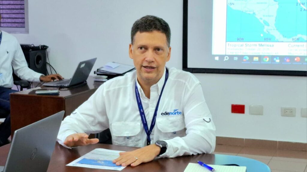 Gustavo Martínez, gerente general de EDENORTE destacó que por la ubicación geográfica del área de concesión de la empresa, estamos históricamente expuestos a eventos atmosféricos, y en el caso de la tormenta Melissa, va a traer muchas lluvias e incrementará las incidencias.
