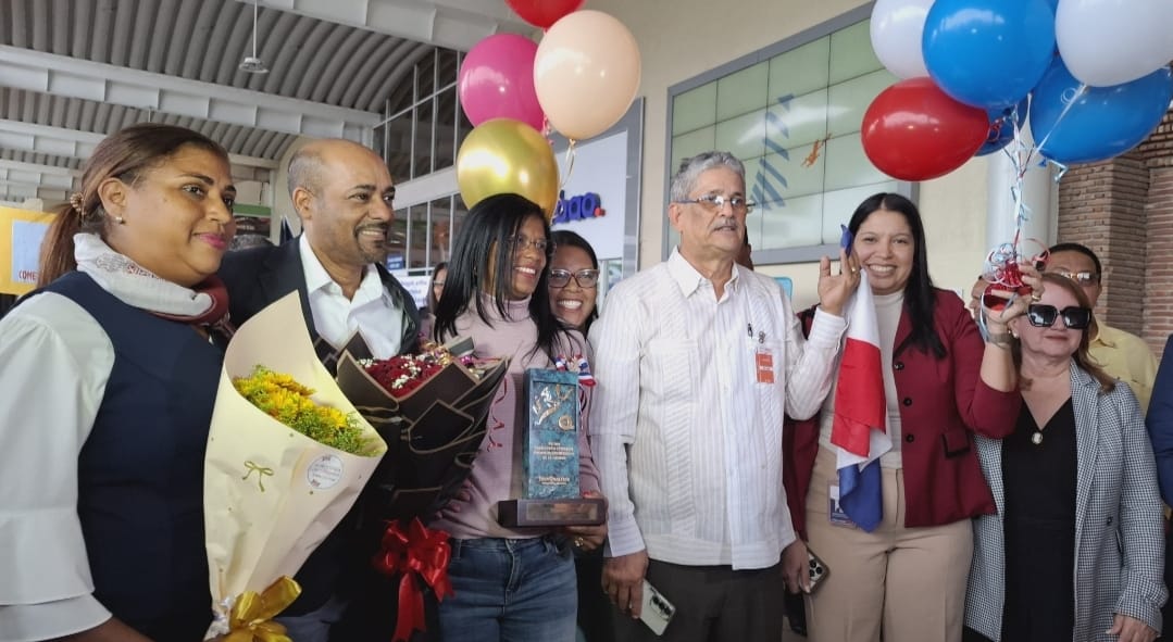 Santiago.- Reunidos en el Aeropuerto Internacional Cibao, maestros y estudiantes para recibir a la delegación del centro educativo Cometas de Esperanza, ganador del Premio Iberoamericano a la Calidad entregado en Madrid.