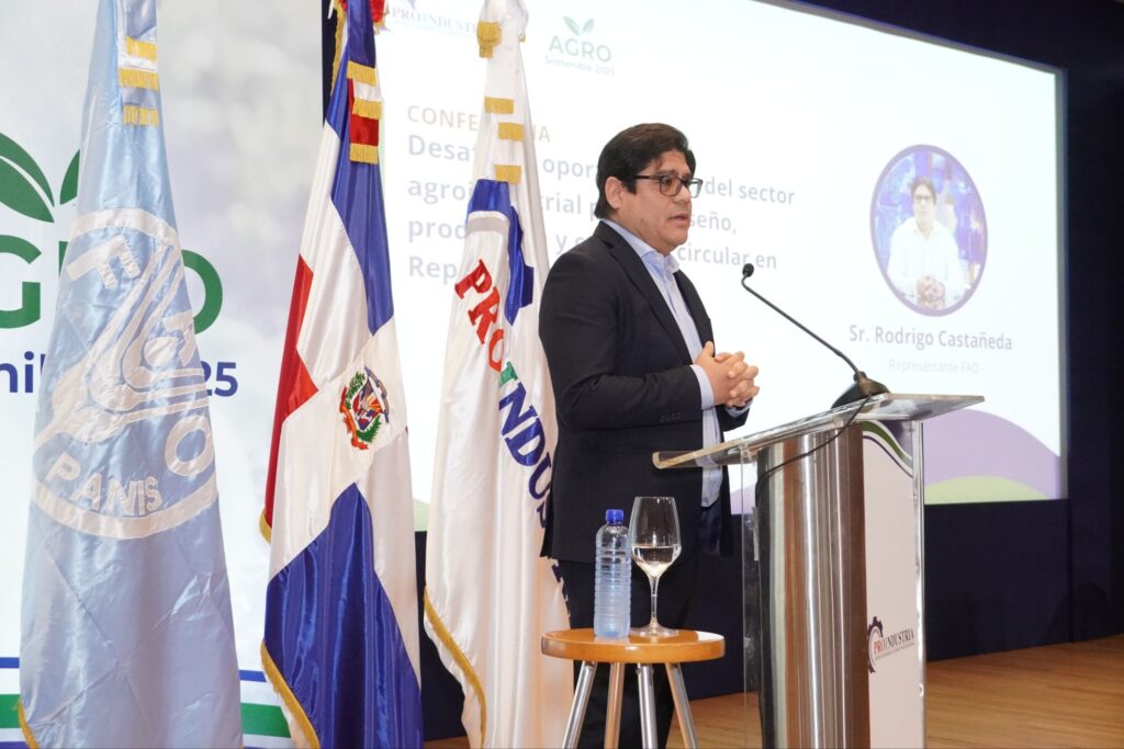 La jornada de Agro Sostenible 2025 se desarrolló en dos bloques principales. En primer lugar, se llevó a cabo la conferencia magistral titulada “Desafíos y oportunidades del sector agroindustrial para el diseño, producción y consumo circular”, dictada por Rodrigo Castañeda, representante de la Organización de las Naciones Unidas para la Alimentación y la Agricultura (FAO) en la República Dominicana.