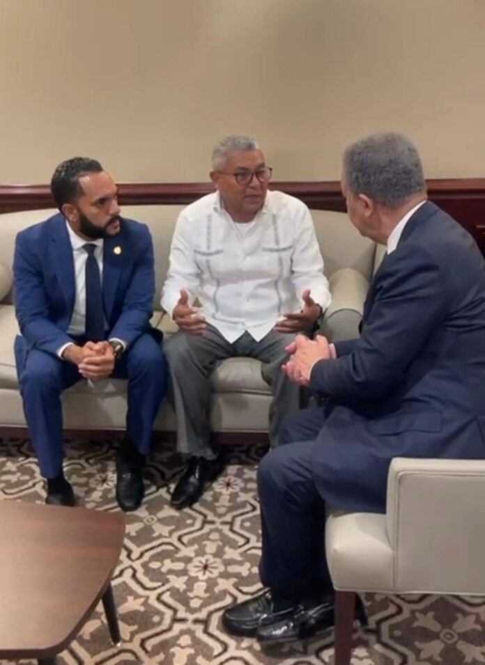 Expresidente del PLD en New Jersey y coordinador de Justicia Social en el exterior conversa animadamente con el expresidente Leonel Fernández, sobre aspectos políticos relacionados con la gran alianza nacional del pueblo que procura derrotar la improvisación y el atraso que representa el actual gobierno.