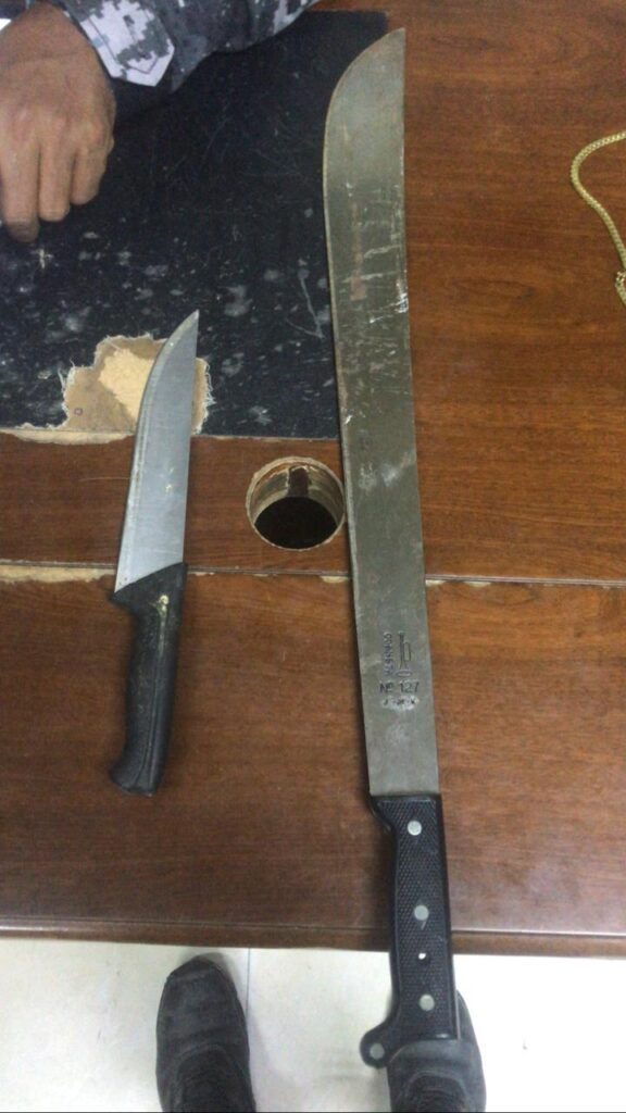 Dichos vehículos fueron ocupados por los miembros preventivos de la Policía Nacional que practicaron los arrestos, junto a dos armas blancas (un cuchillo y un colín), que tenían dos de ellos, tras recibir una llamada de emergencia a través del 9.1.1., denunciando el hecho.