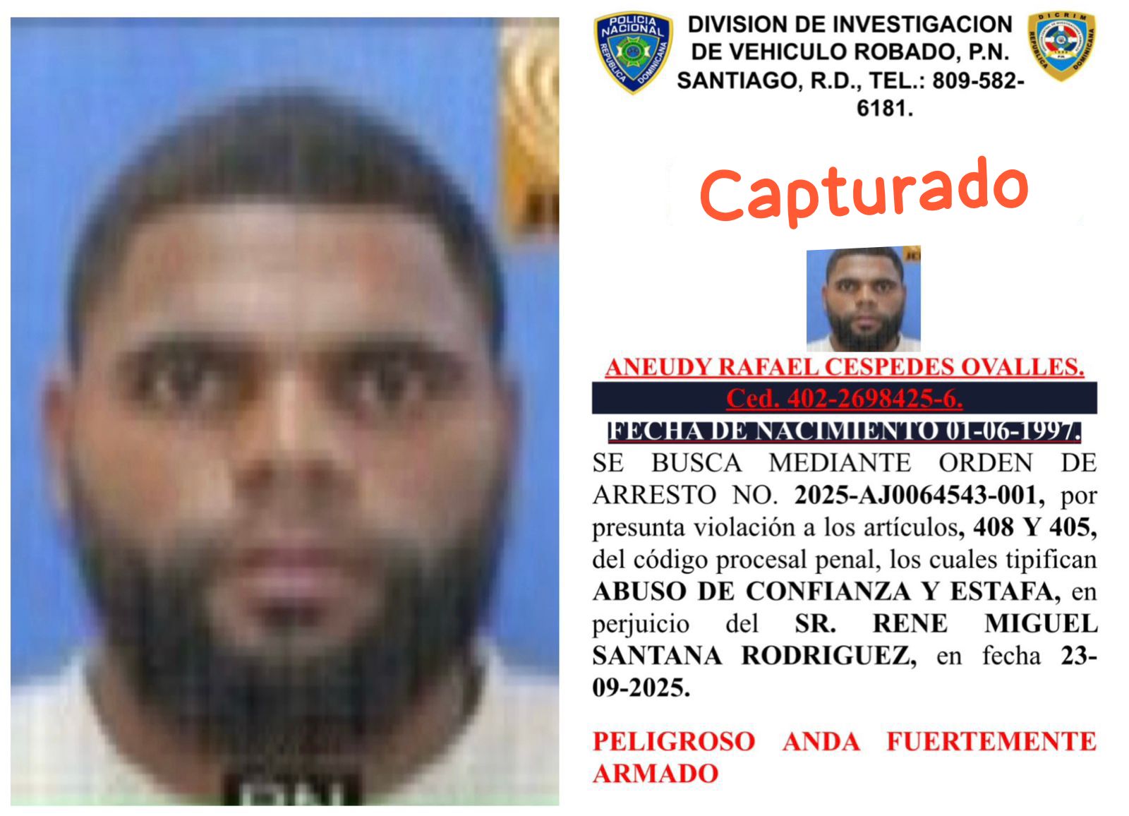 Santiago de los Caballeros. – Tras intensas labores de seguimiento e investigación, agentes de la Policía Nacional capturaron a Aneudy Rafael Céspedes Ovalles, alias “Aneo”, de 28 años, quien era activamente buscado mediante múltiples órdenes de arresto y señalado como presunto autor de diversos hechos delictivos relacionados con la sustracción de vehículos mediante abuso de confianza y estafa.