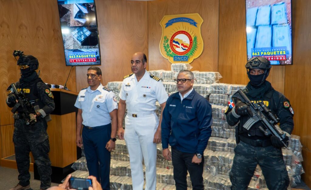 Santo Domingo.– En un extenso despliegue de fuerzas conjuntas y combinadas, agentes de la Dirección Nacional de Control de Drogas (DNCD), efectivos de la Armada de República Dominicana (ARD), la Fuerza Aérea (FARD) y agencias de Inteligencia del Estado, coordinados por el Ministerio Público, intervinieron un cargamento de 863 paquetes, presumiblemente cocaína, en medio de una ininterrumpida persecución por aire, mar y tierra en las costas de la provincia Pedernales.